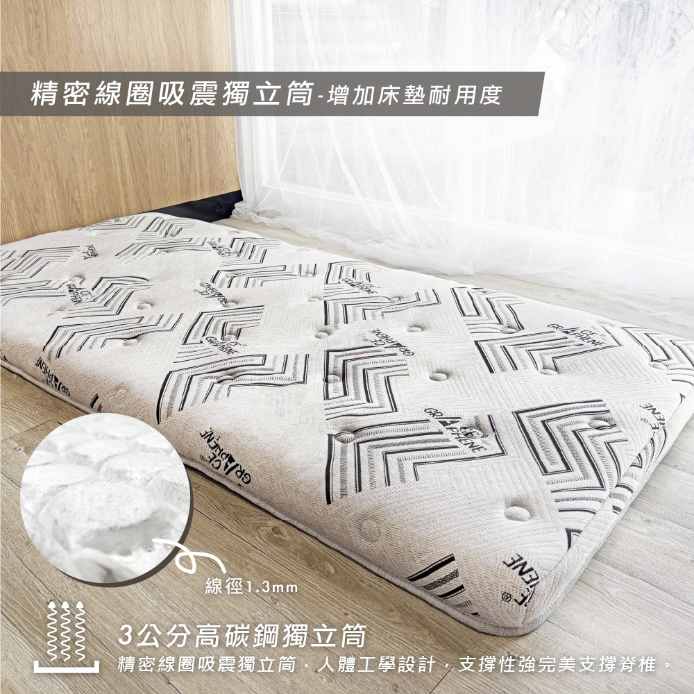 ●抗干擾設計,翻身、起身不影響枕邊人,全床3公分高碳鋼獨立筒-線徑1.3mm設計,增加床墊耐用度。
